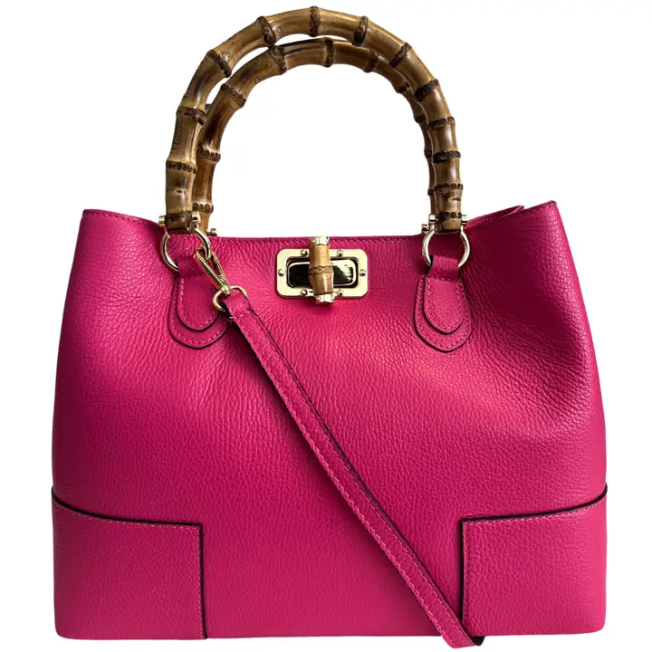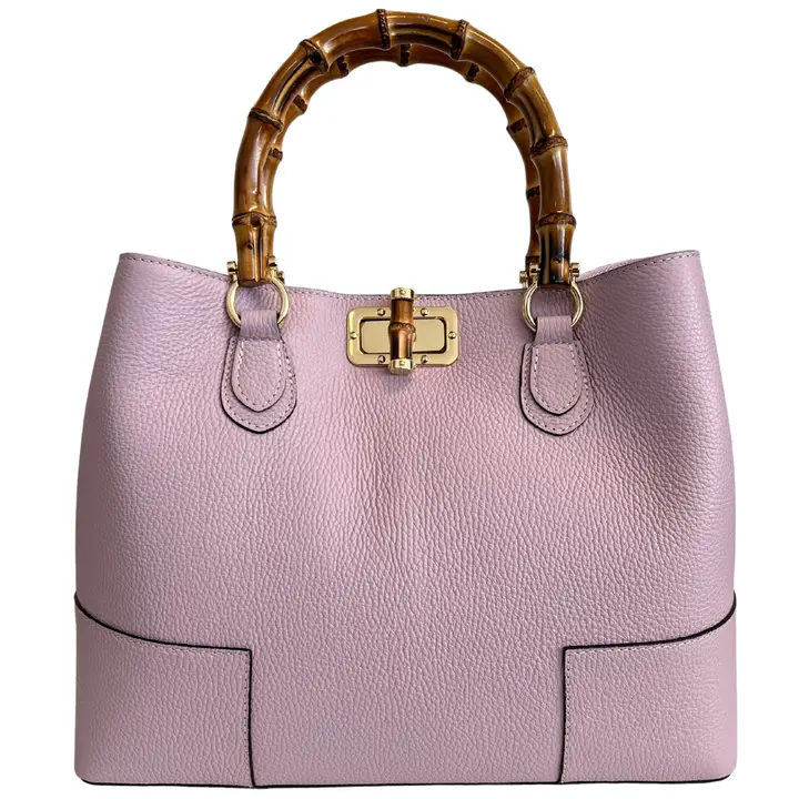 Genuine leather handbag with bamboo handles embellished with a metal and bamboo interlocking closure and handcrafted in Italy