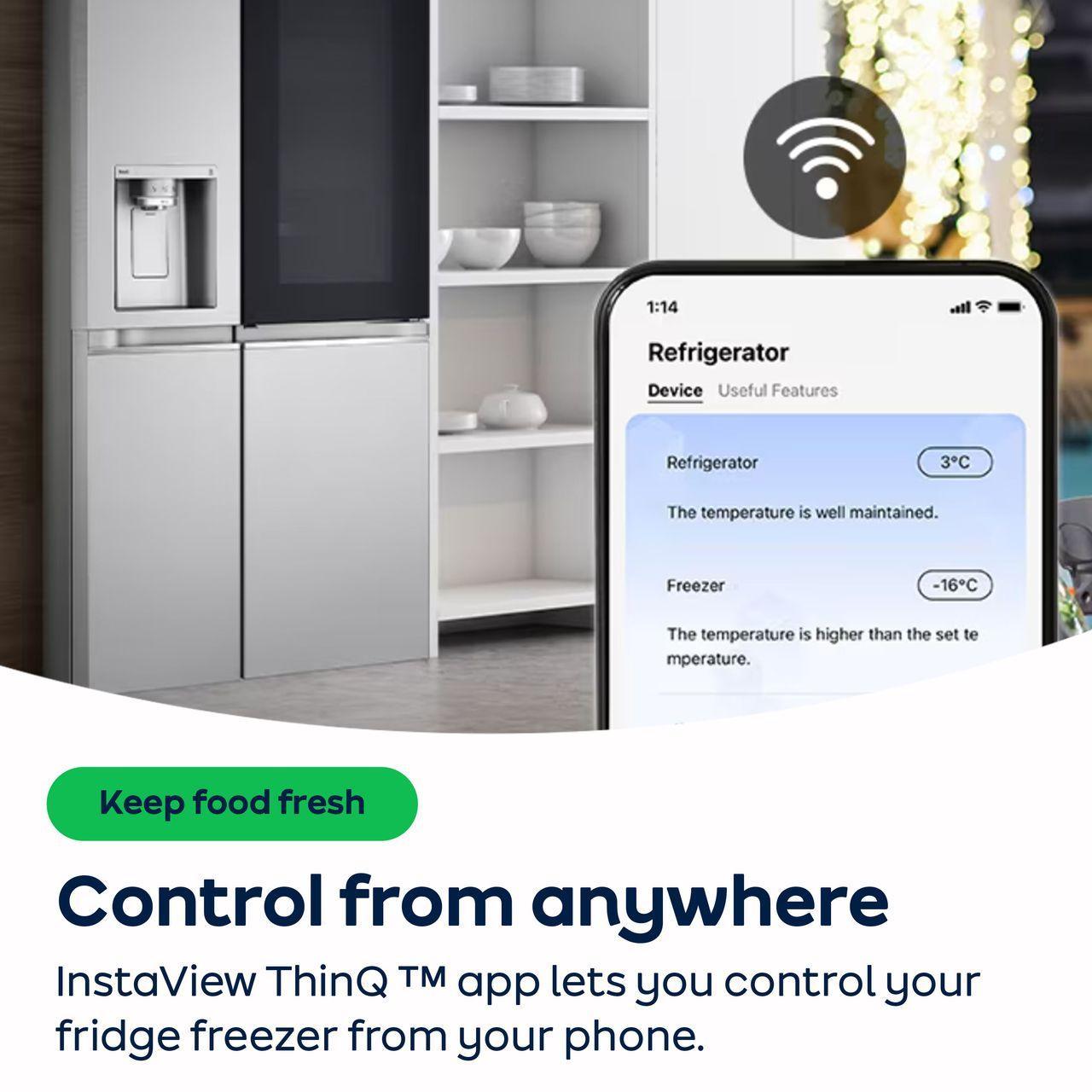 Control your fridge from your smartphone with LG ThinQ™ technology. You can adjust temperature settings or freeze items when you’re on the go, in a meeting or just don’t want to leave the sofa.